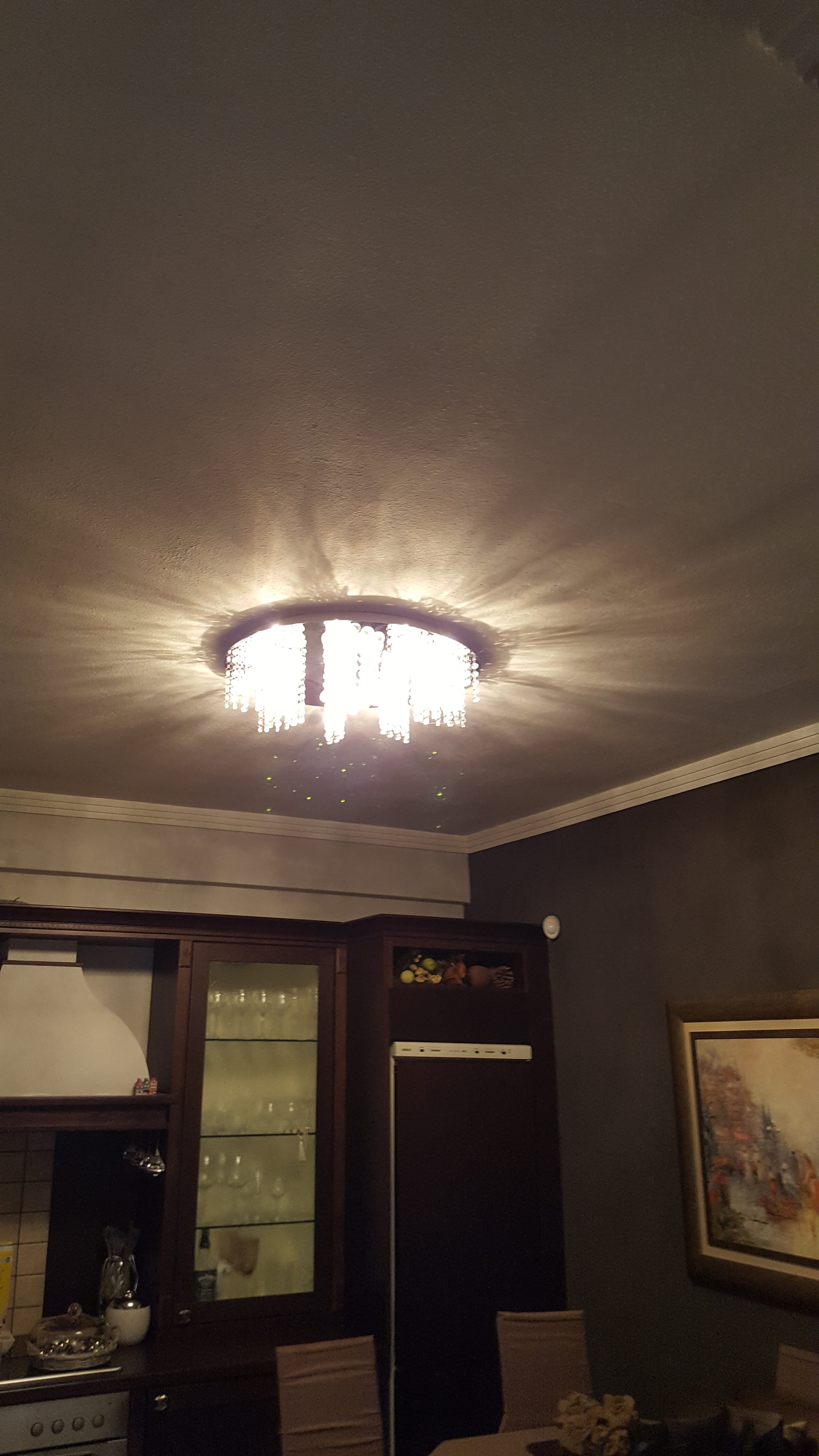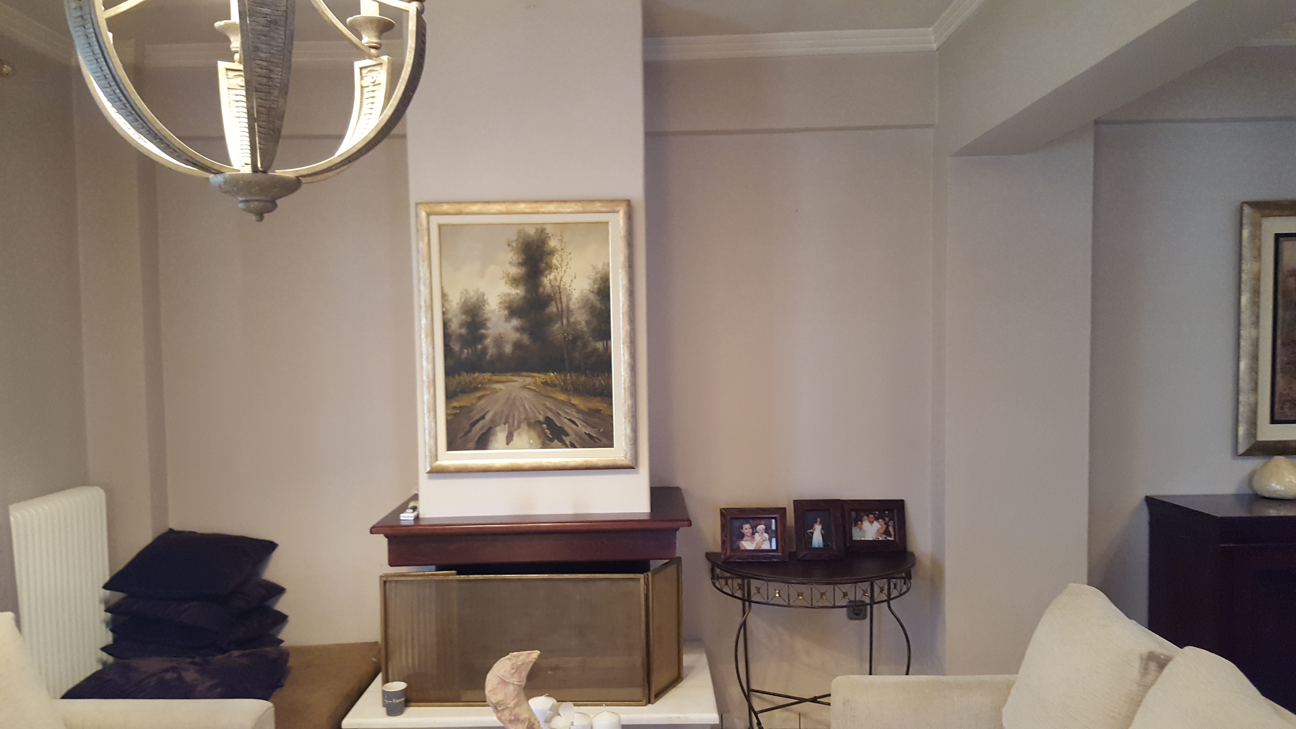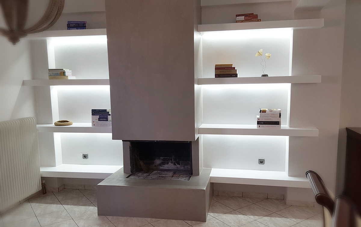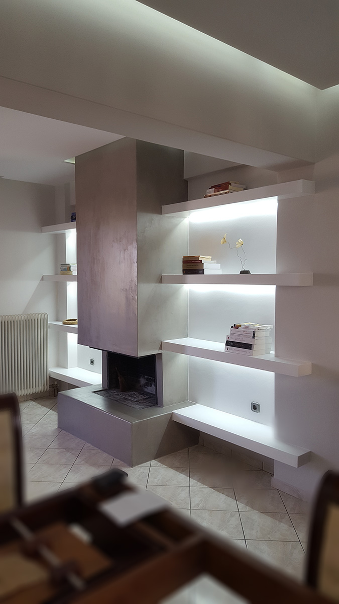 Ακολουθούν φωτογραφίες από πρόσφατη Ανακαίνιση-διακόσμηση με πατητή τσιμεντοκονία σε σαλόνι και συγκεκριμένα στην οροφή του σαλονιού και στο τζάκι με φωτιζόμενα ράφια από γυψοσανίδα, καθώς και στην κουζίνα και τραπεζαρία.
