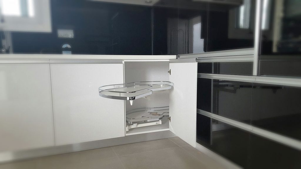Επίσης μεγάλη εξοικονόμηση χώρου επιτεύχθηκε με την χρήση μηχανικών γωνιακών ραφιών της εταιρείας Diastassis.