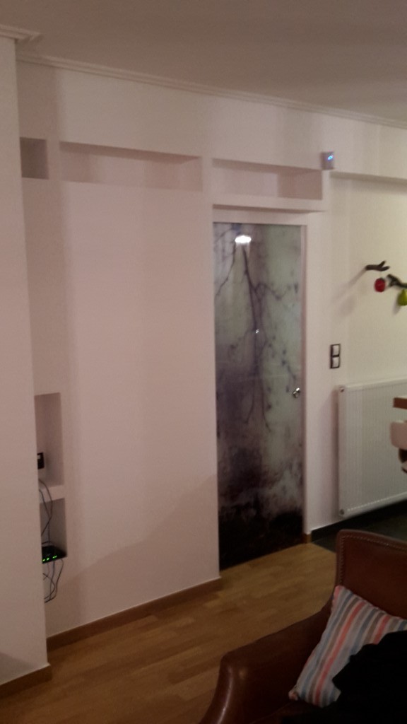- κρυφή γυάλινη πόρτα με εκτύπωση πίσω από διακοσμητική διαχωριστική γυψοσανίδα.