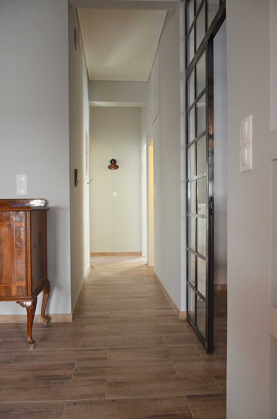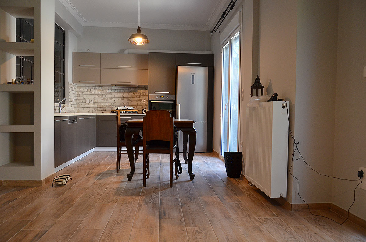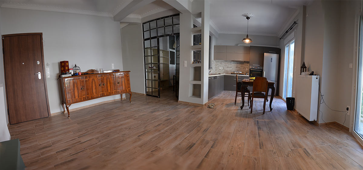 Το διαμέρισμα ήταν δεκαετίας τουλάχιστον 1980 και ο χώρος βρισκόταν σε πολύ άσχημη κατάσταση όπως φαίνεται από τις φωτογραφίες Πριν. Η πλήρης ανακαίνιση περιέλαβε τους εξής τομείς: