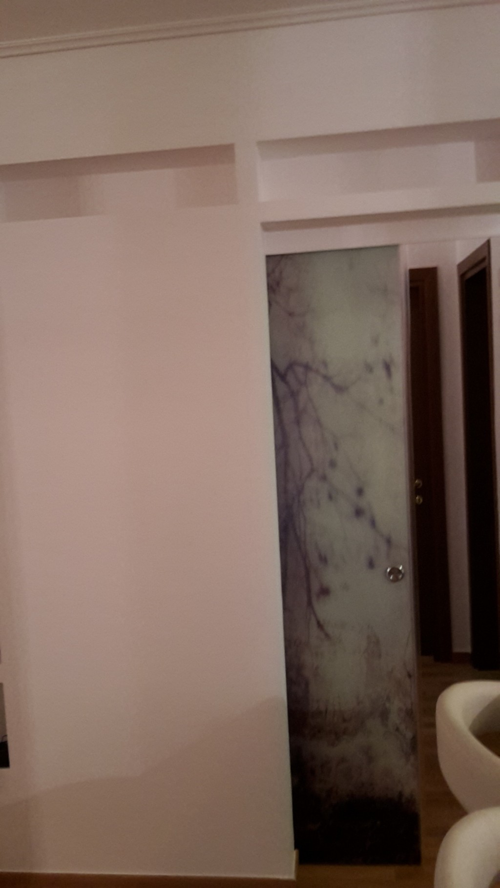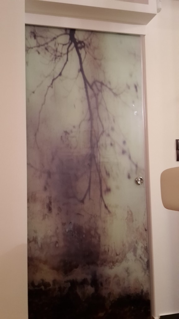 - κρυφή γυάλινη πόρτα με εκτύπωση πίσω από διακοσμητική διαχωριστική γυψοσανίδα.
